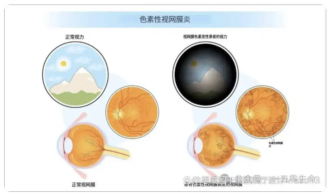 视网膜色素变性(RP)是一组异质性遗传性视网膜疾病,主要由损害视网膜细胞功能和存活能力的基因突变引起。RP通常始于视杆细胞退化,导致夜盲症和周边视野丧失(管状视野),随后影响视锥细胞,终在晚期导致完全失明。