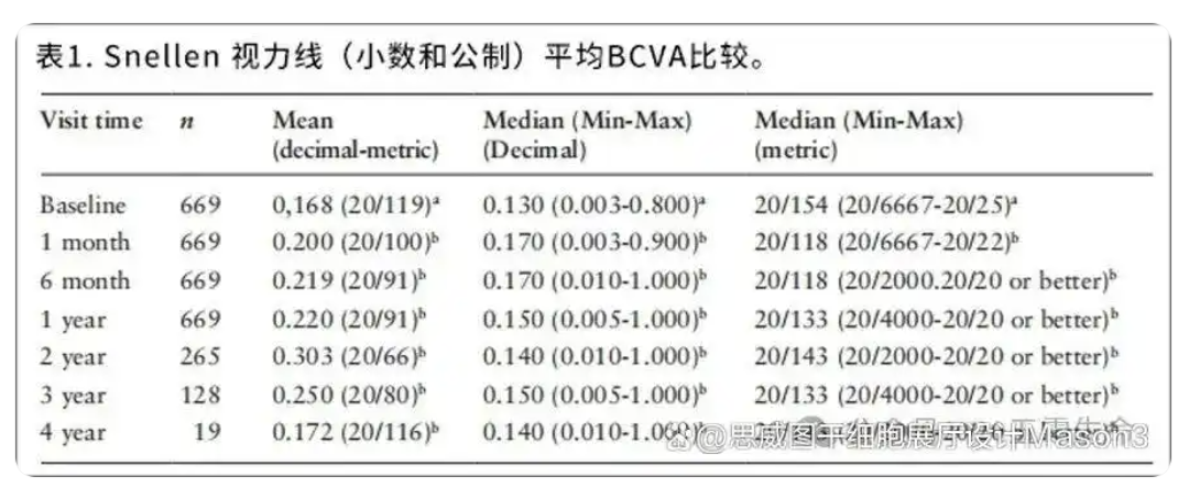 ②视力改善情况:在治疗后的前2年内,观察到BCVA有统计学意义上的改善。基线BCVA为0.168 Snellen线,第一年提高到0.220,第二年进一步上升到0.303,较基线视力提升了80%。第三年下降至0.250,第四年下降到 0.172,但仍高于基线值(表1)。