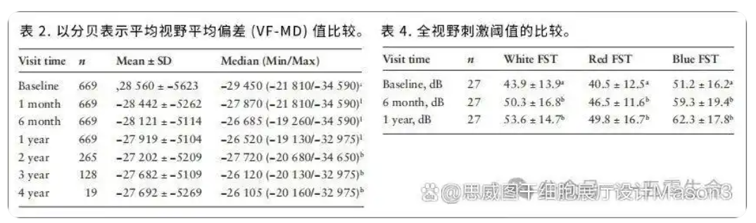 ③视野改善情况:在治疗后的前2年内,检测到VF平均偏差(MD)显著增加。基线MD为-28.560分贝(dB),第一年提高到-27.919,第二年提高到-27.202,较基线视野提升了近1倍。尽管在第三年(-27.682)和第四年(-27.692)有所下降,但结果仍然优于基线。