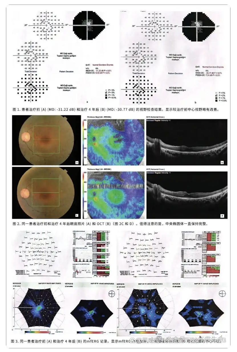 ⑥长期随访结果:图1-3展示了其中1例患者治疗前后的VF、光学相干断层扫描(OCT)和mfERG结果,与治疗前相比,治疗后4年虽没有达到显著改善,但也没有恶化,且还保持着略微改善。