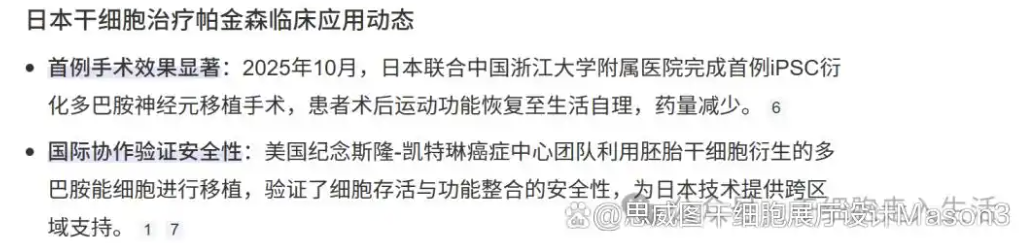 · 帕金森病治疗:日本京都大学团队主导的全球首例iPSC治疗帕金森病的人体临床试验已取得初步积极结果。他们将由iPSC分化产生的多巴胺神经前体细胞移植入患者脑内,以替代受损的神经元,长期观察显示细胞存活且部分改善了患者症状。