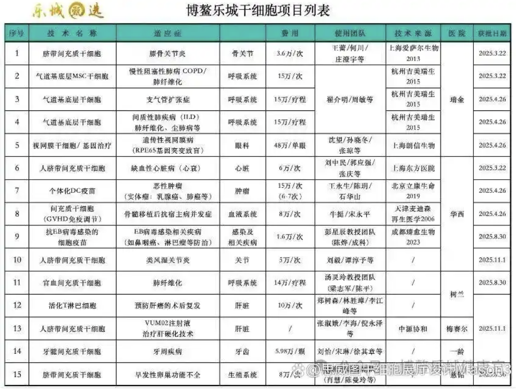 与市场同类技术相比,乐城技术定价更具普惠性:卵巢功能不全治疗从 20-40 万元降至 8 万元,肺纤维化治疗比市场价低 1 万余元,骨髓移植后抗宿主病治疗已纳入医保支付试点。价格区间从 1.6 万元至 48 万元,适配不同病情需求,让更多患者能负担得起前沿治疗。