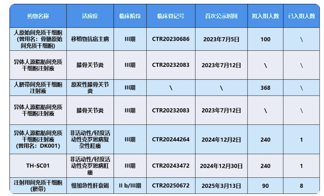 国内目前有6款干细胞疗法处于Ⅲ期临床试验阶段,覆盖移植物抗宿主病、膝骨关节炎、克罗恩病肛瘘及慢加急性肝衰竭等适应症,具体如下: