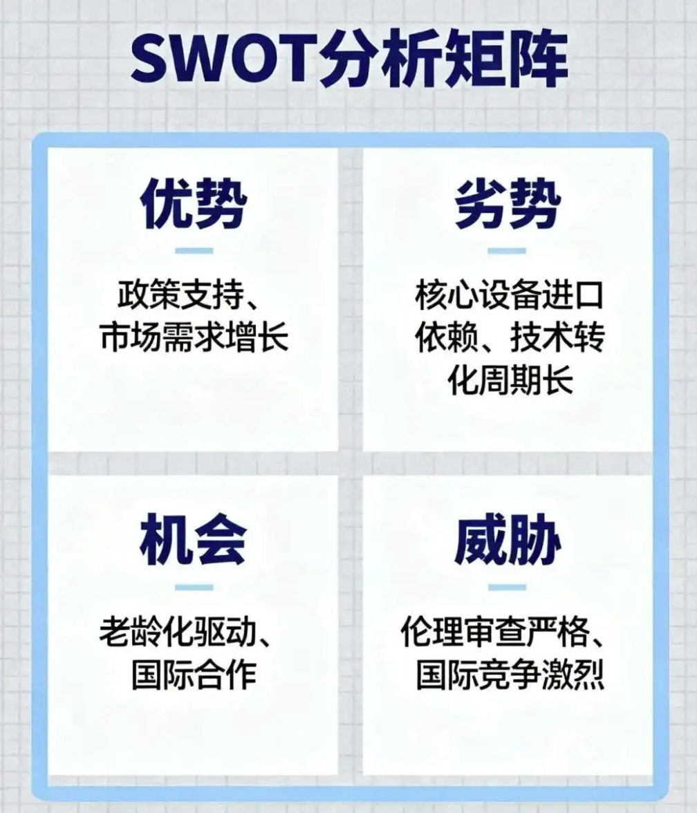 核心发展路径:政策优化(医保覆盖+审批加速)→技术突破(材料自主化)→国际合作→标准建立→万亿级产业集群。