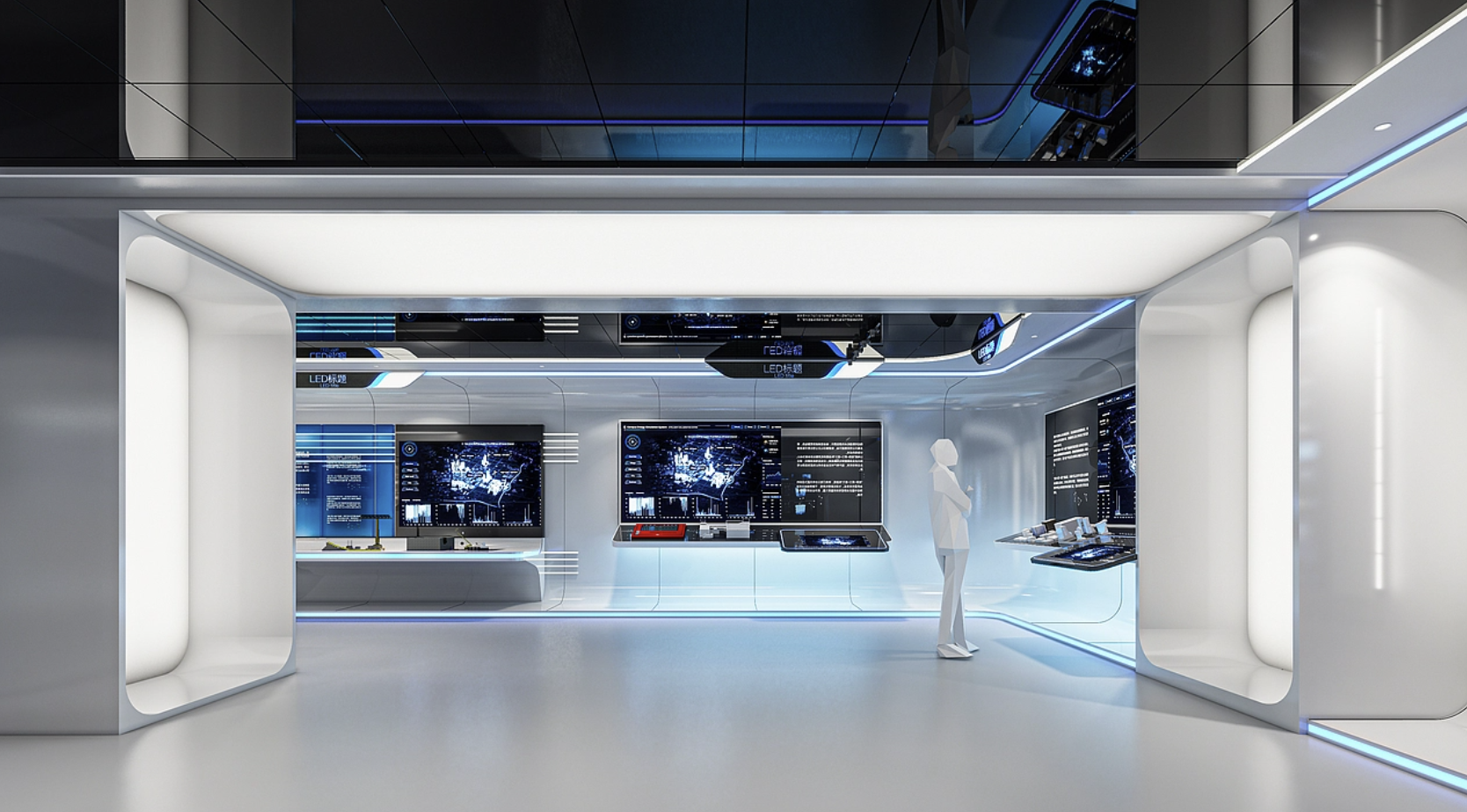打造有“呼吸感”的空间氛围,强化主题辨识度。干细胞关乎生命与再生,空间设计需平衡科技感与自然感。主色调选用深蓝搭配荧光绿,墙面用激光雕刻细胞分裂纹理,搭配流线型展具呼应生命形态。引入智能调光系统,随时间变化切换冷白、暖黄、深蓝光影,模拟细胞分裂、再生、休眠的昼夜节律;当观众聚集时,局部送风轻微增强,模拟细胞代谢的“呼吸感”,让空间从容器变成有生命的有机体。