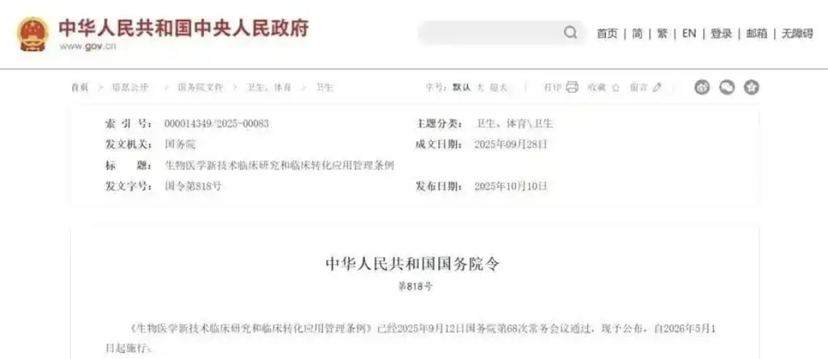 国务院第818号令公布的《生物医学新技术临床研究和临床转化应用管理条例》(以下简称《条例》),为CAR-T、干细胞等热门生物医学技术划定了明确的“游戏规则”。从研究备案到临床应用,从风险防控到医保衔接,每一条规定都直接关系着患者的权益与行业的走向。今天我们对照条例原文,拆解这些新规背后的民生意义。